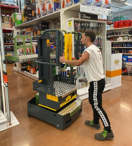 Mit Abmessungen von nur 0,70 x 1,00 Metern und einem Eigengewicht von 350 kg ist der Elevah40B Picking besonders kompakt und leicht zu manövrieren. Das handverschiebbare Design in Kombination mit einem intuitiven Dreirad-Fahrsystem ermöglicht eine einfache Handhabung auch in engen Räumen, wie beispielsweise zwischen Regalreihen oder in schmalen Lagergängen. Die Aluminiumkonstruktion sorgt dabei für Stabilität und Langlebigkeit bei gleichzeitig geringem Gewicht. Optional kann ein patentiertes Ladesystem erworben werden, das den Transport des Geräts auf einem Pick-up oder Transporter erleichtert.